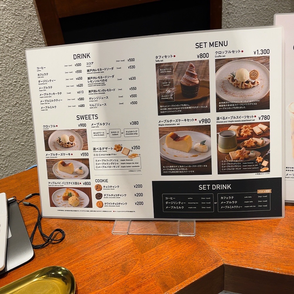 The menu features a variety of coffee and tea-based drinks, including specialty lattes and iced beverages, alongside a selection of sweet and light food items. Visitors can expect options such as lattes paired with pastries like croissants or financiers, shaved ice desserts, and combinations involving butter sandwiches and other sweets. The offerings are suitable for coffee breaks, light snacks, and casual meal occasions throughout the day.
